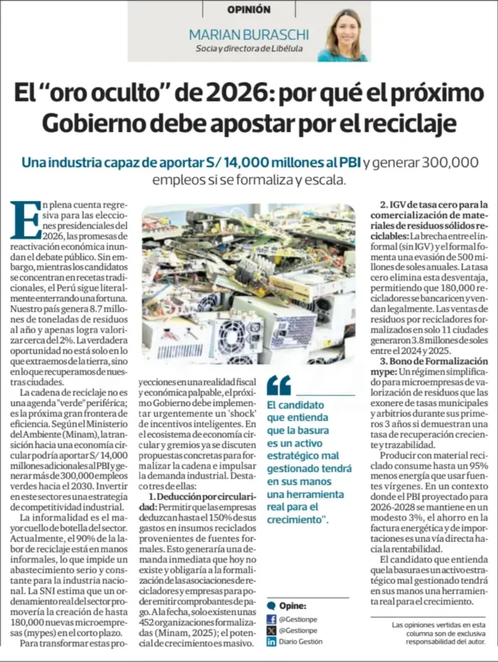 En plena cuenta regresiva para las elecciones presidenciales de 2026, las promesas de reactivación económica inundan el debate público. Sin embargo, mientras los candidatos se concentran en recetas tradicionales, el Perú sigue literalmente enterrando una fortuna. Nuestro país genera 8.7 millones de toneladas de residuos al año y apenas logra valorizar cerca del 2%. La verdadera oportunidad no está solo en lo que extraemos de la tierra, sino en lo que recuperamos de nuestras ciudades.